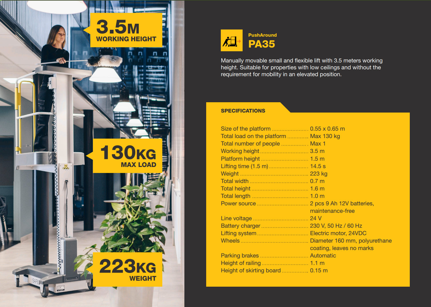 Deze Safelift PA35 is een zeer compacte hoogwerker voor binnen gebruik. Door zijn lage eigen gewicht en compacte afmetingen past hij overal tussendoor en kan hij door elke deur naar binnen.