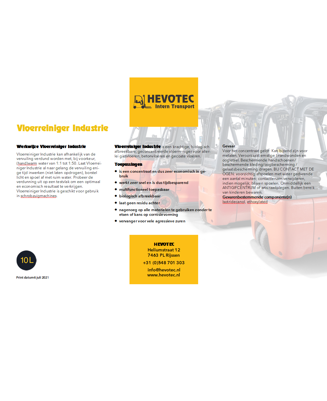 Vloerreiniger Industrie is een zeer krachtige, biologisch afbreekbare, geconcentreerde vloerreiniger voor zwaar(der) vervuilde vloeren. Deze vloerreiniger Industrie is geschikt voor werkplaatsen etc. De vloerreiniger is een concentraat en daardoor economisch in gebruik. Vloerreiniger Industrie is een reinigingsmiddel speciaal ontworpen voor schrobmachines. Deze vloerreiniger is de vervanger van de agressieve zuren.